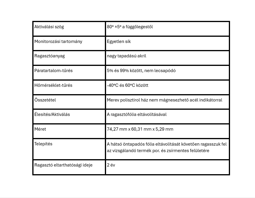 A dőlés bekövetkezése esetén az eszköz visszafordíthatatlan jelzést ad, amely egyértelmű bizonyítékot biztosít a nem megfelelő kezelésről. Használatával jelentősen csökkenthetők a szállításból és tárolásból eredő károk, valamint az ezekből fakadó anyagi veszteségek.