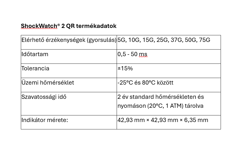 A ShockWatch ® 2 QR egy egyszer használatos, elemmentes ütésjelző, amely a bevált ShockWatch 2 vizuális aktiválási technológiát QR-kódos csatlakozással ötvözi . Amikor a kiválasztott küszöbértéket meghaladó ütés történik, az eszköz QR kód alatti felülete - élénkpirosra vált, és okostelefonnal beolvasva naplózza a lényeges szállítmányinformációkat – időpontot, dátumot, helyszínt és sorozatszámot. Ez a digitális nyomon követési réteg páratlan láthatóságot biztosít a termékek szállítás közbeni kezelésével kapcsolatban.