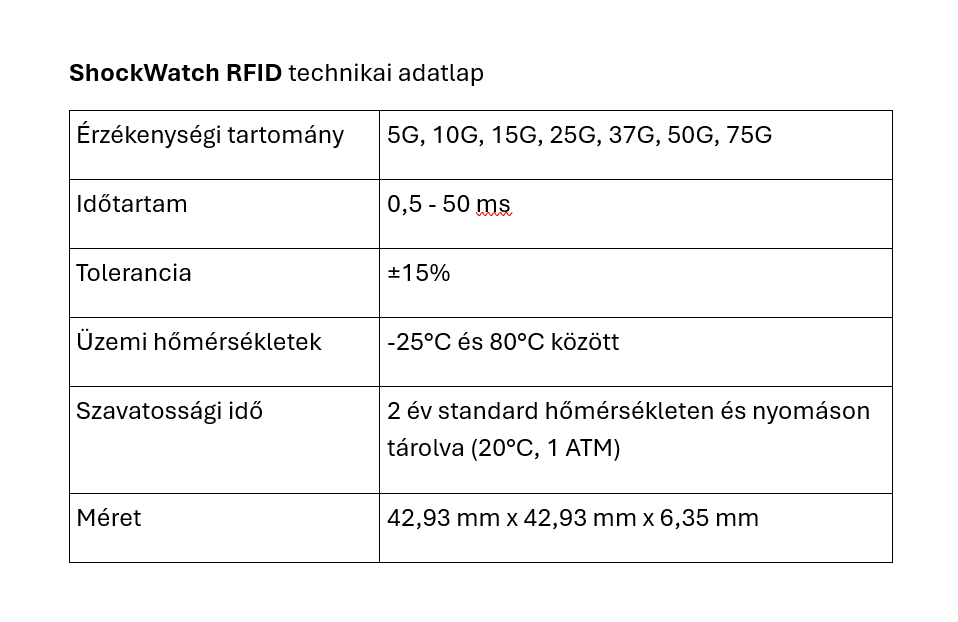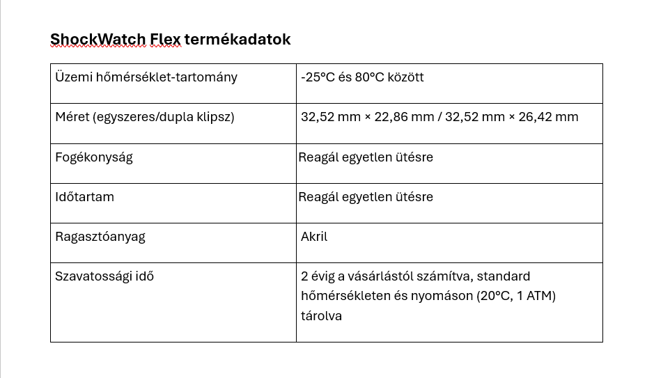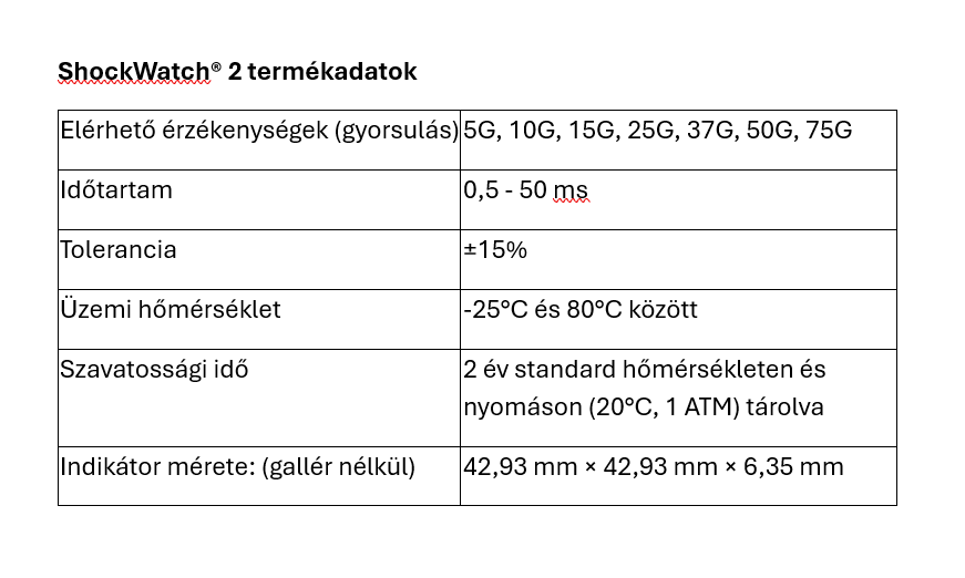 A ShockWatch ® 2 egy egyszer használatos, elemmentes ütésjelző, melyet figyelemfelhívó szintén öntapadós gallérral lehet kiegészíteni. Amikor a kiválasztott küszöbértéket meghaladó ütés történik, az eszköz EAN kód alatti/feletti felülete - élénkpirosra vált.